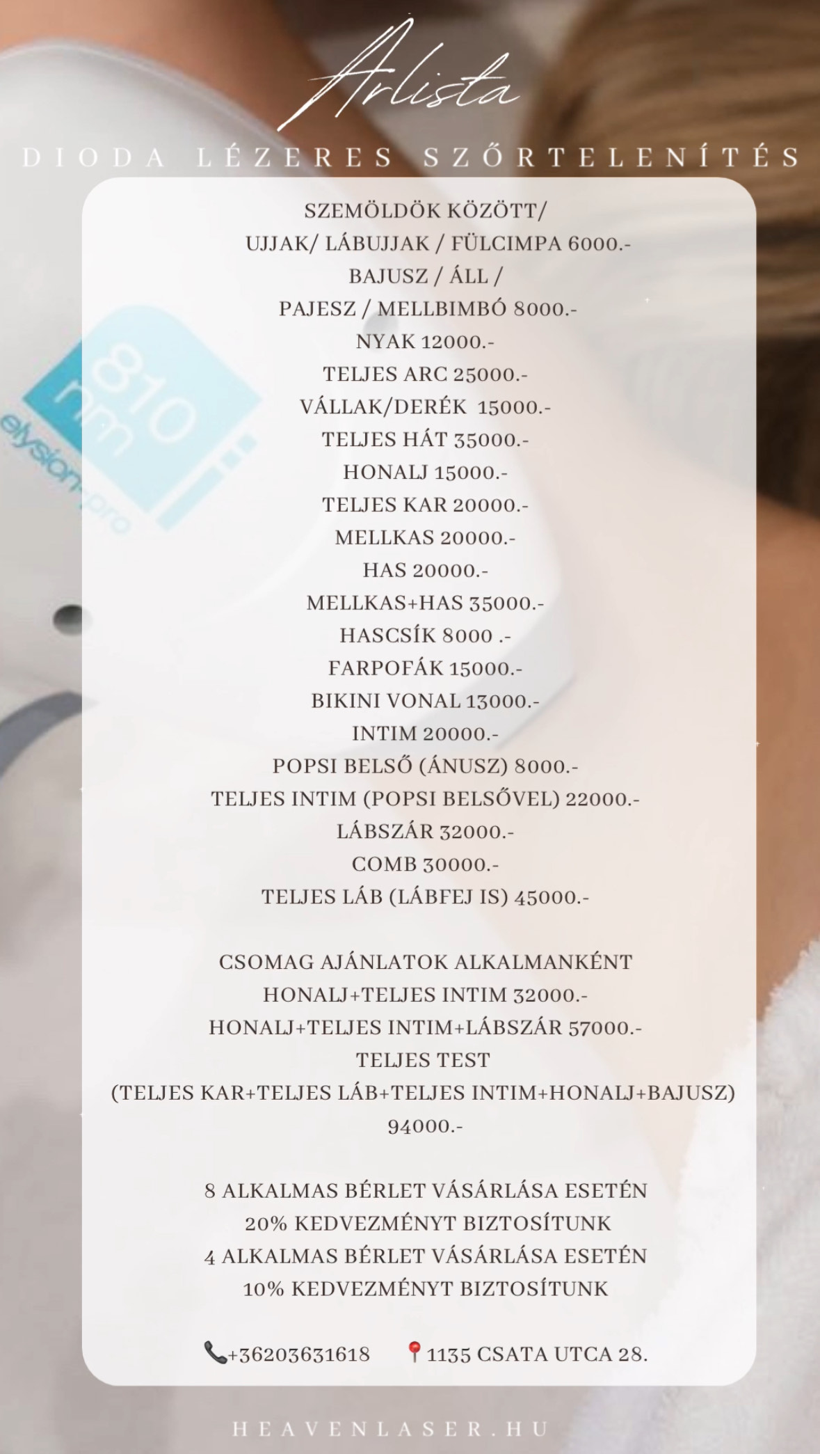 - A Heaven Laser-ben használt Elysion Pro dióda lézeres készülék egyedi „kristályos fagyasztó rendszerrel” rendelkezik. Ez a rendszer a szőrtelenítés teljes ideje alatt megfelelő hűtést biztosít, így az eljárás fájdalommentes, csak enyhe csipkedő érzést lehet érezni a kezelés közben.
